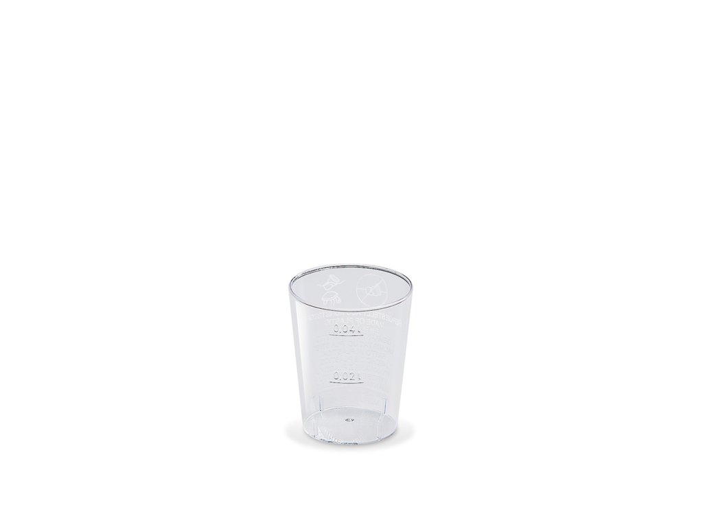 Praktický průhledný plastový pohárek ideální pro přesné dávkování alkoholických nápojů, degustace nebo cateringové akce.